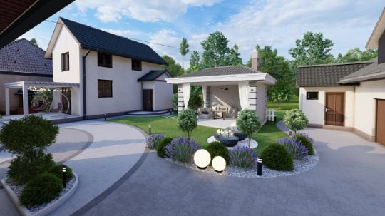 Основне завдання: Розробити цікаву та комфортну ідею, насичивши кожний куток саду функціональністю. Спроектований сучасний піднавіс для авто, обіграли перепад сходами та композицією клумби.