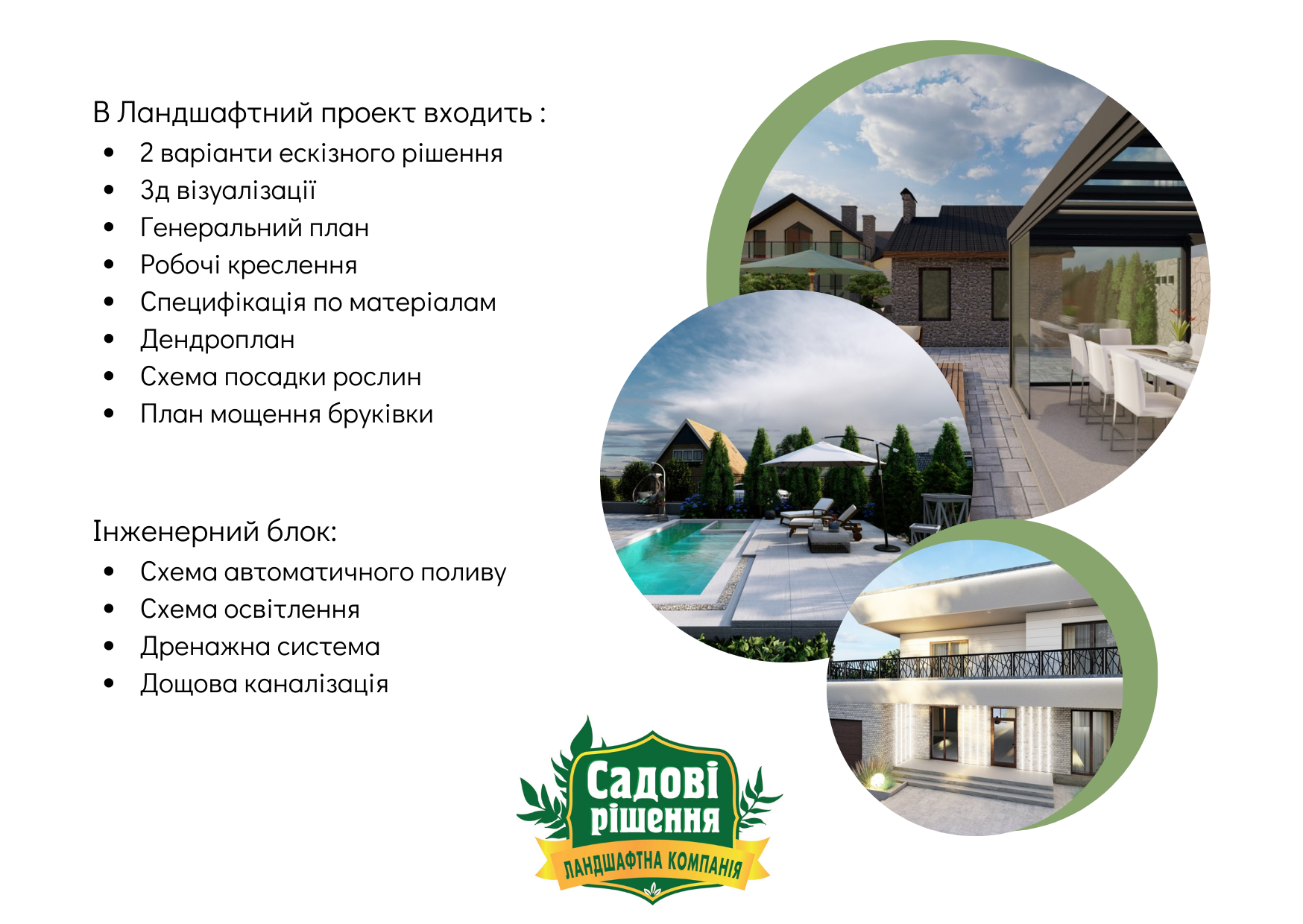 Проєкти розробляються індивідуально для кожної діляни з урахуванням побажань замовника, творчого погляду фахівця, архітектурних, планувальних та інженерних рішень.